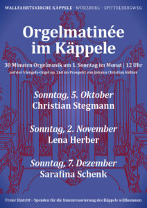 Herzliche Einladung zur Orgelmatinée auf dem Käppele am Sonntag, 02.11.25 um 12.00 Uhr. Am Sonntag, 02.11.25 um 12.00 Uhr findet in der Wallfahrtskirche wieder eine Orgelmatinée statt. Im Anschluss an die zweite Sonntagseucharistiefeier hören wir Orgelmusik von verschiedenen Komponisten. An der Orgel Frau Lena Herber. Der Erlös ist für die Renovierung der Wallfahrtskirche.